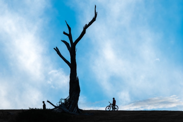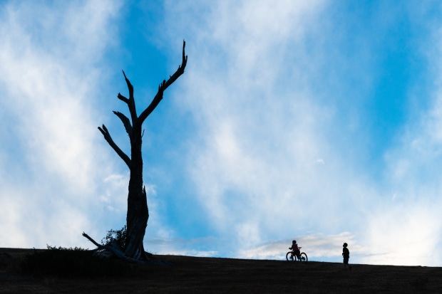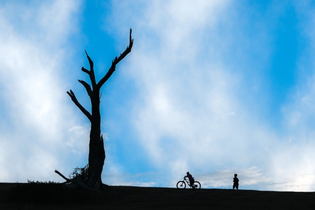 Taken in Victoria's high country just before sun set. The boys had decided riding/walking to the top of this short but steep hill would be a great thing to do before dinner, so they could hurtle all the way down (and repeat for as long as they could!). By this time that last bit of the hill was getting steeper, and these shots were captured showing that final ascent, and that one moment of rest before the fun of the descent. The sky with its stripy cloud pattern was beautiful and, as it often seems in the country, just so vast.