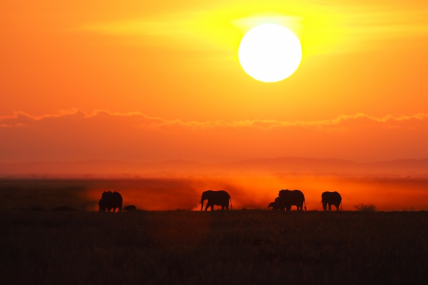 On a morning game drive in the Amboseli National Park in Kenya, the sunrise through the fine dust cast a red glow across the plains. As we edged forward on the road, appreciating the sunrise, a small herd of elephants appeared in silhouette over the shallow rise, the herd raising more dust as they kicked at the roots of plants on their morning feed. The contrast was compelling: of colour and silhouette; and of the drama of the colour and peaceful feeding amble of the elephants.