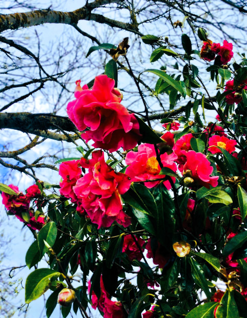 Camellias in full blown beauty, to aging and petals burning brown but still incredibly beautiful