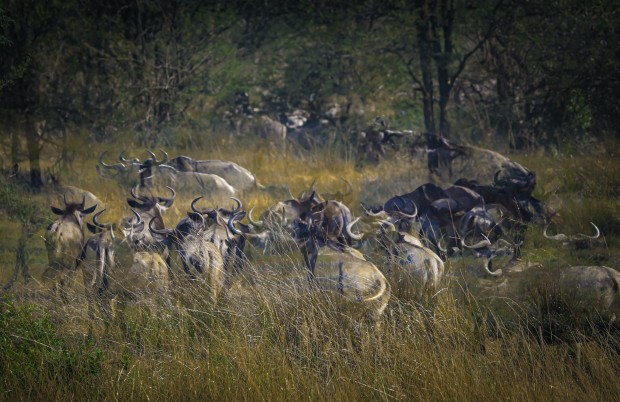Part of The Great Migration as the Wildebeest cross the Mara river the lions wait with anticipation to hunt.