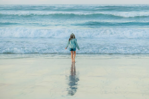 A vibrant young lady being fearless as she approaches the ocean's edge but will she go into the blue or will she run when the waves get close as they roll onto the shore?