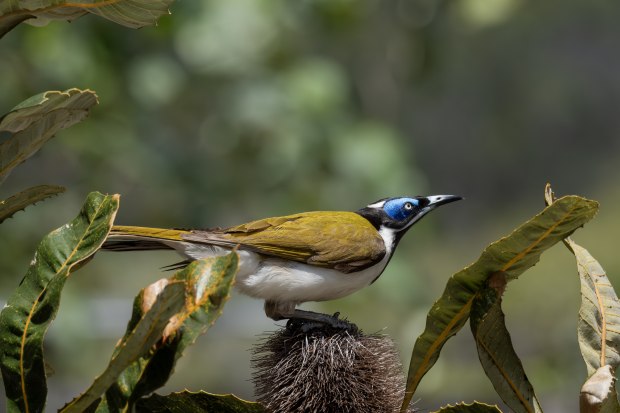 A beautiful Blue Faced Honeyeater ready to fly from the Banksia bushes of the Wollum K'gari (Frazer island)