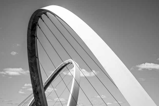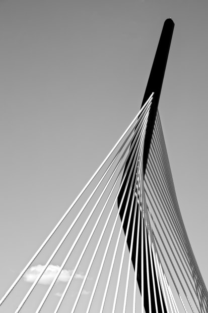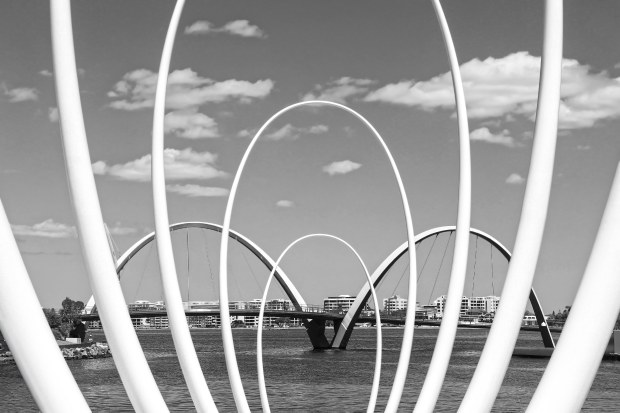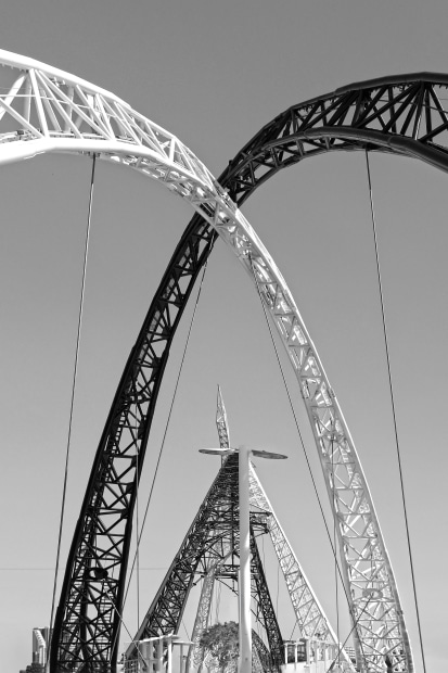 There are three beautiful pedestrian bridges in Perth that visually enhance our city as well as adding to the enjoyment of our environment and the functionality of our public spaces. They are the Elizabeth Quay Bridge, Matagaruo Bridge and Boorloo Bridge. I am fascinated by the graceful and dramatic shapes they make against the sky, ever changing as one moves around or across them. I have chosen to depict them in black and white to foreground these shapes.