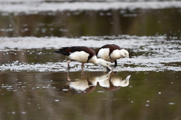 2 Burdekin ducks hunting for food in the Lagoon. Taken early afternoon was able to get a great reflection off the water.