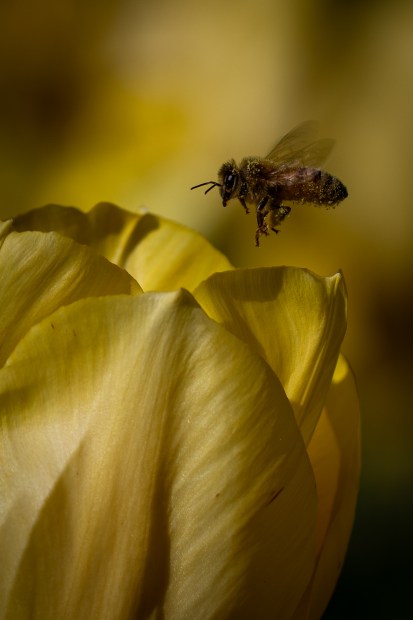 Tulips are more of a supplemental stop for bees, offering limited nectar and pollen. This bee dusted in golden pollen certainly made the most of its visit.