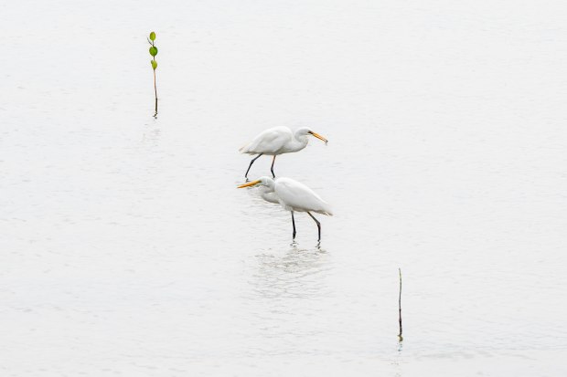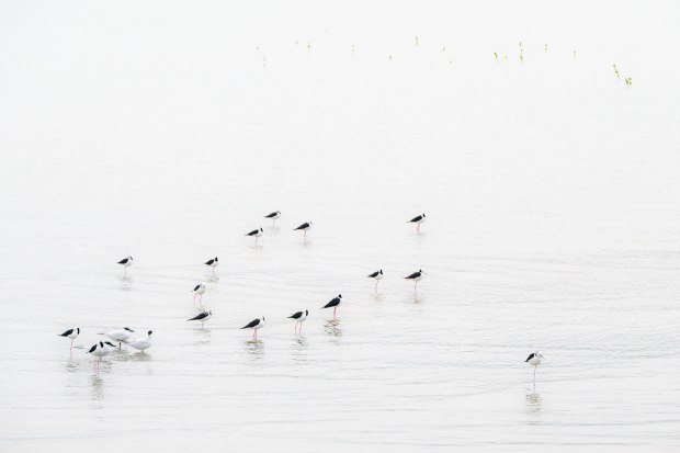 Taken as the tide was coming in on Cairn's waterfront. The birds shown are pied stilts (with red legs) and egrets, the former seemed to be happy standing around in the rising waters, the egrets (one particularly) seemed a little hungrier and were wandering around looking for fish. It is easy to malign the mudflats but given the opportunity there is a lot more activity (and beauty) to this area than I had realised!
