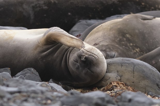 An elephant seal pup shows great pleasure relieving a chin itch while resting belly up surrounded by massive adults on a rocky beach.