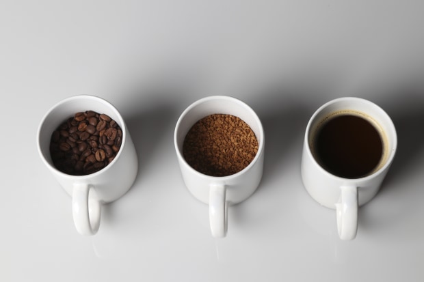 Demonstrating the stages from left to right, how coffee is produced from beans to liquid gold, which everyone loves.