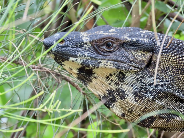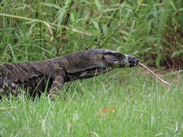 A local Lace Monitor (Goanna) being spotted in the grasses riverside at Audrey Royal National Park, eventually emerging to take a look at the photographer.