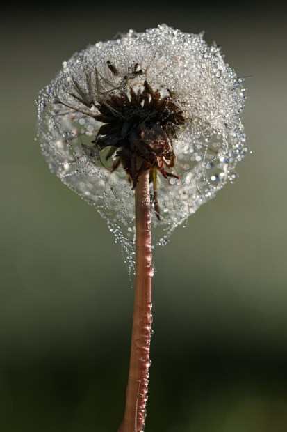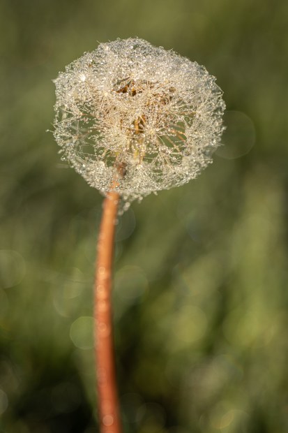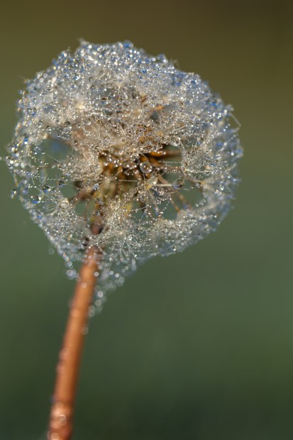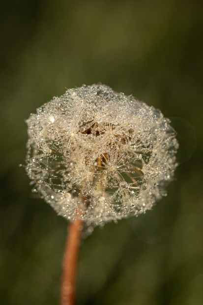 Dandelion seed head with its fluffy top (pappi) covered in dew drops on a cold frosty morning, The early morning sunshine makes the dandelion clock sparkle and glisten