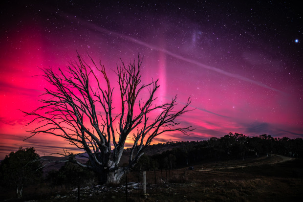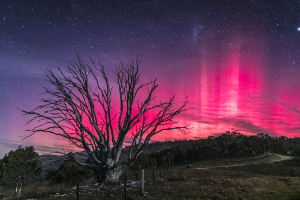 The vivid colours of the Aurora Australis play out across the southern skies near Canberra, Australia, casting ethereal light over a stark, lifeless tree. This series explores the contrast between the fleeting beauty of the aurora and the enduring presence of decay. The tree, long dead yet standing firm, mirrors the resilience of the land while framed by the vibrant, shifting sky—where death and beauty coexist in perfect, haunting balance.