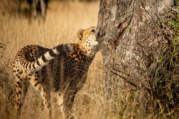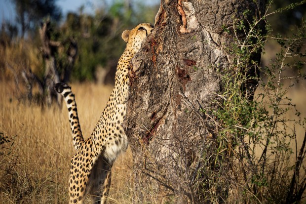 A cheetah examining, then climbing a tree, and looking down upon the world from top of the tree. Unusually, this lone Cheetah male surprised us with his astoundingly Leopard-Like Moves.
