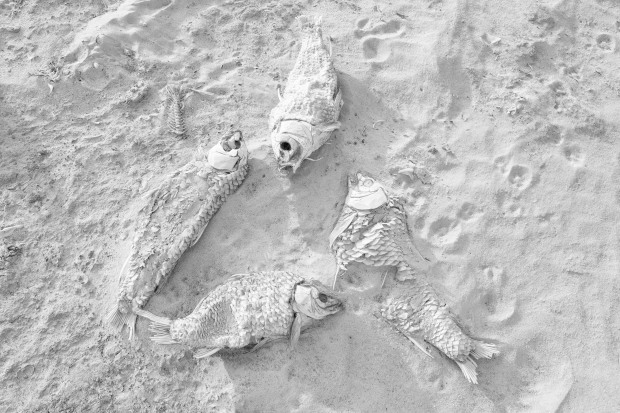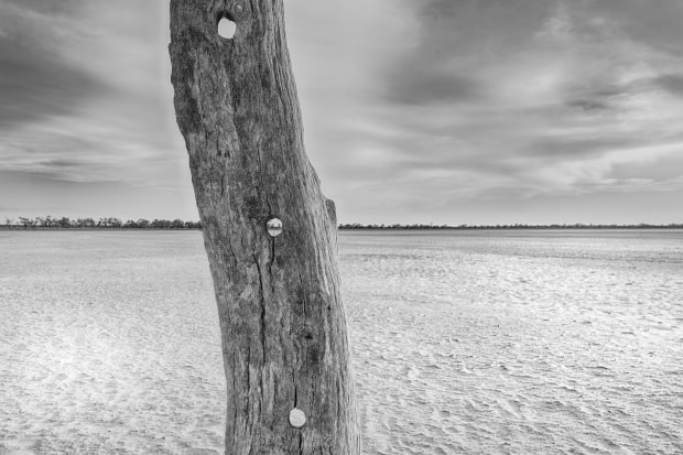 Fletchers Lake near Mildura captured during the dry. A salt pan white, flat and seemingly featureless. After walking around, I decided to capture the sparse, monochrome environment through a series of vignettes. The vignettes reveal the animal and human activity in the area. Emus cross the lake, people camp, fish are stranded and die.