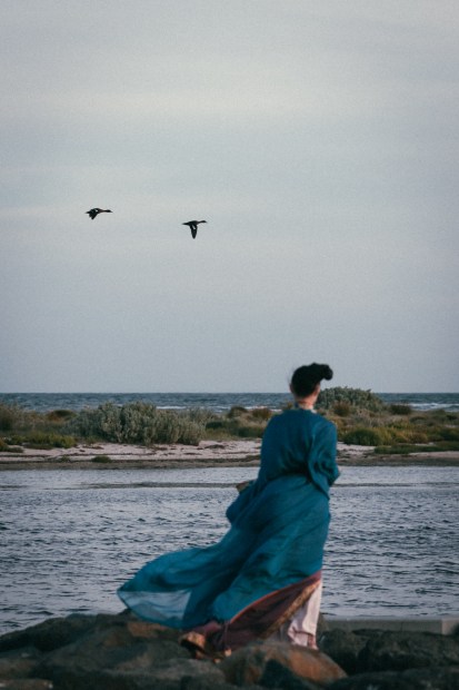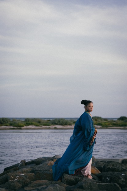 Clad in garments inspired by the Warring States period (Warring States Robe of Hanfu), she stands by the sea- a figure of stillness against the endless waves. This series captures a moment suspended between history and nature, where the past seems to echo in the wind and tide.