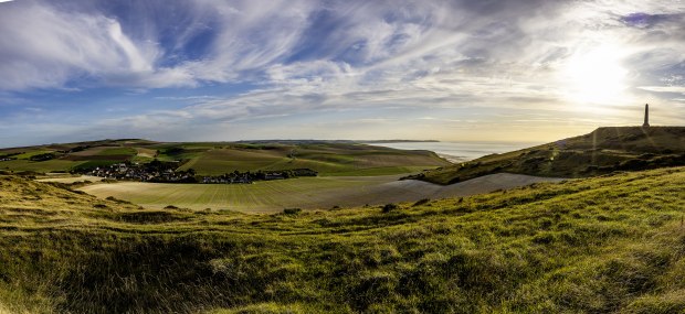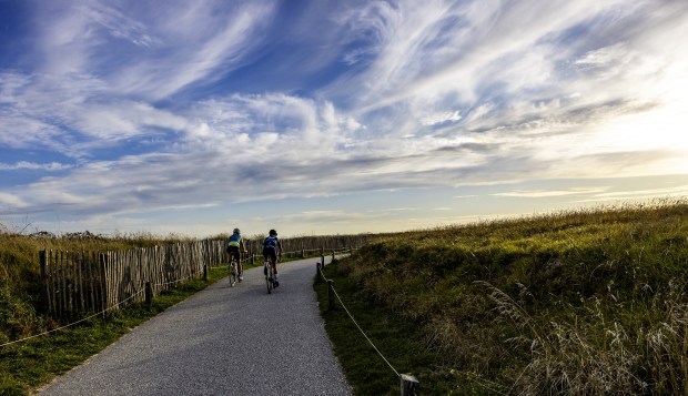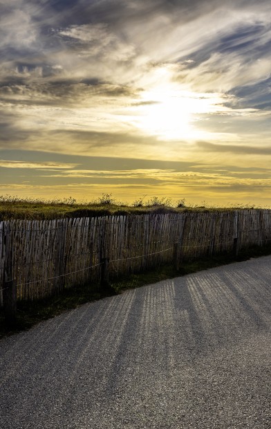 Golden light spilling across windswept hills, quiet fields rolling toward the sea — this is the Opal Coast at sunset. From the top of Cap Blanc-Nez, the monument stands like a sentinel watching over France and the distant English shore. Cyclists glide along the path, framed by soft skies brushed with streaks of blue and gold. It’s the kind of evening that makes you slow down, breathe in the salt air, and realise how peaceful the world can feel when the day fades into light and shadow.