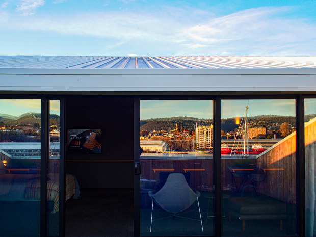 The balcony holds its quiet line between worlds. Glass doors reflect the harbour so completely that outside and inside fold into one another, dissolving boundaries. In this moment, the room is not a room at all but a threshold, an edge of elsewhere where place and reflection blur into something transient and elusive