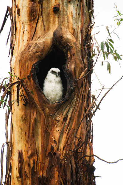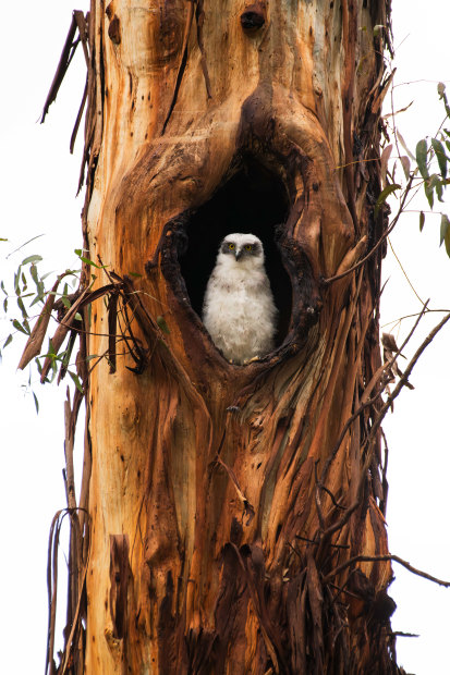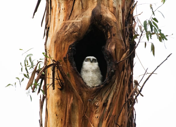 A powerful moment of quiet observation — a young owl perched safely within the hollow of an aged eucalyptus. The weathered textures of the trunk frame the bird like nature’s own sculpture, contrasting the owl’s soft white feathers with the raw, enduring bark. Captured in stillness, it’s a portrait of resilience and refuge — the harmony between life and its sheltering environment.