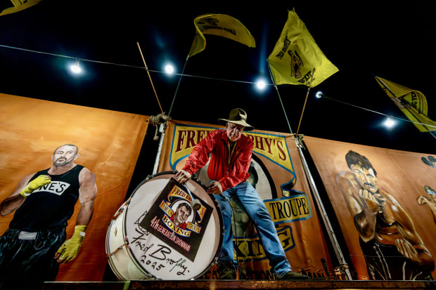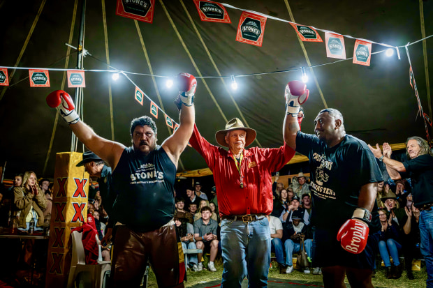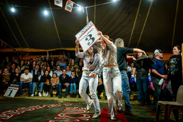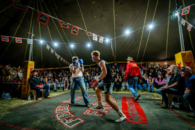 The Fred Brophy Travelling Boxing tent has been a fixture at local fair grounds, country rodeos and outback towns for 43 years. Fred, a 4th generation showman has finally bowed to political correctness and announced that 2025 will be his last year. These pictures were captured at the Mount Isa Rodeo in August 2025 after a torrid day in the saddle for the cowboys and cowgirls competing in the Southern Hemisphere's largest and richest rodeo. Despite the fact that Fred's troupe of professional boxers take on locals wannabes off the streets, Fred is a stickler for safety and referees each match with concern for both fighters, ending some rounds early and checking closely on flights in between rounds.