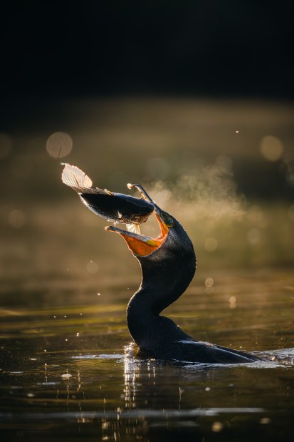 A Great Cormorant succeeded in hunting an invasive fish which has quickly overrun the ponds at the fringes of a Conservation area. While this has meant native fish are probably outcompeted, they serve as a ready source of food for Great Cormorants nesting nearby. Lake at the Coombabah Conservation Area, Arundel Section.