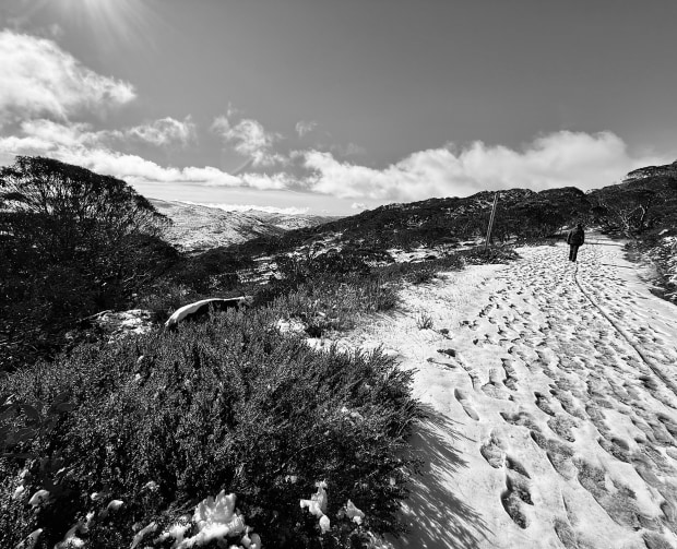 I love the high country of the Snowy Mountains. It changes through the seasons and there is always something different to discover. At Charlotte's Pass during some of the first snow fall I loved the way the light and sky changed so quickly. I found some footprints in the snow and then saw a single hiker. The image of him walking away emphasized the solitary nature and scale of the landscape.