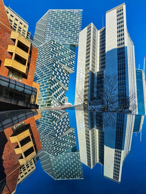 On a brilliant blue sky morning in the city, a beautifully clean and shiny car roof helped me achieve this reflection of some of my favourite buildings.