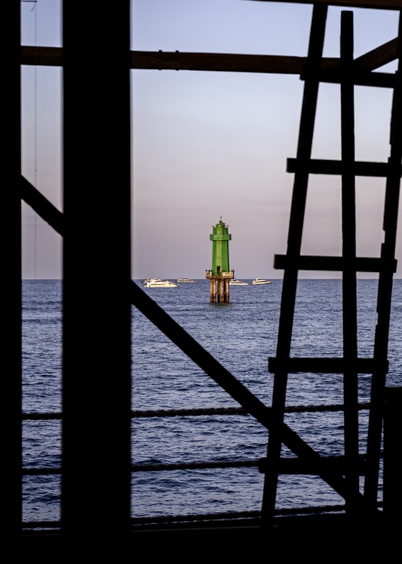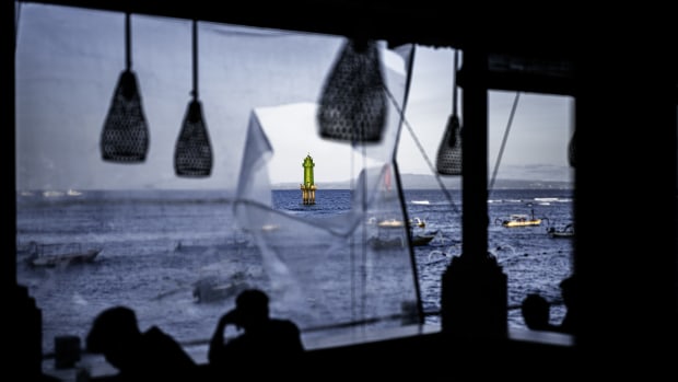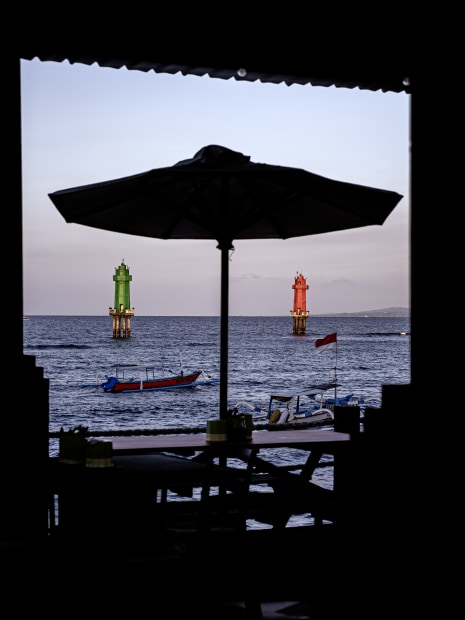 At dusk, walking along the commercial street by Sanur Harhour in Bali, I caught sight of the distant lighthouses through a seaside restaurant. Bathed in the glow of the setting sun, the lighthouse stood illuminated over the calm sea like a painting. The shifting foreground—framed by movement and perspective—became a living frame, while the two lighthouses remained the unchanging Focus Beyond the scene.