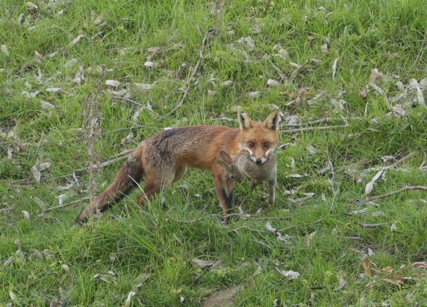Noticed Fox on the run with Bunny around 6.30 one evening, ever so quickly and quietly making its way through the paddock. Taking a quick look at me as l was standing a little higher didn't waste any time in moving on. Image is slightly cropped.