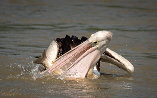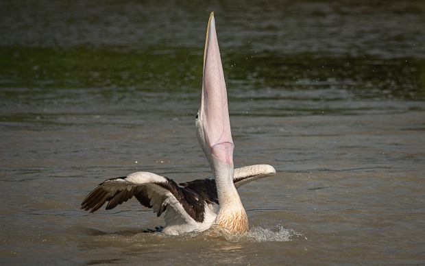 A trip to Shady Camp, NT proved entertaining. Whilst watching a crocodile catch his barramundi for lunch my attention turned to the squadron of pelicans that had taken up residence along the barrage. I was lucky enough to capture his guy who also got a good feed.