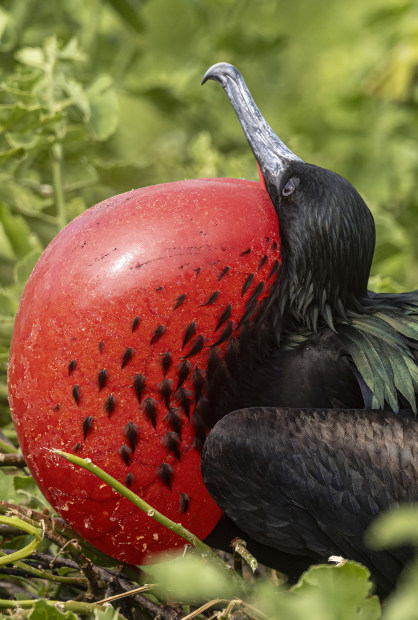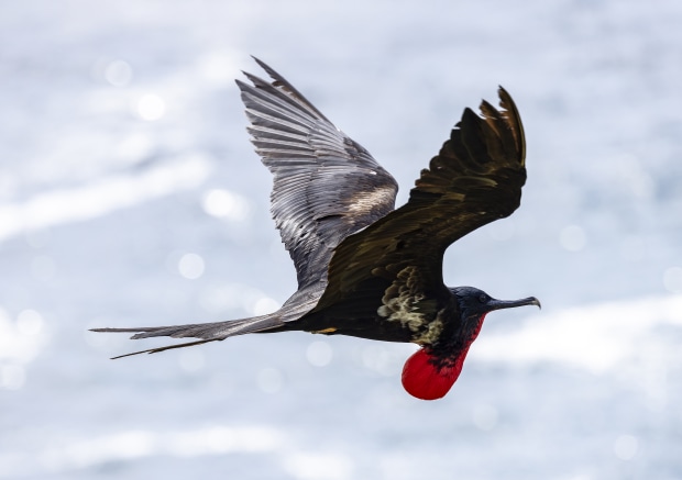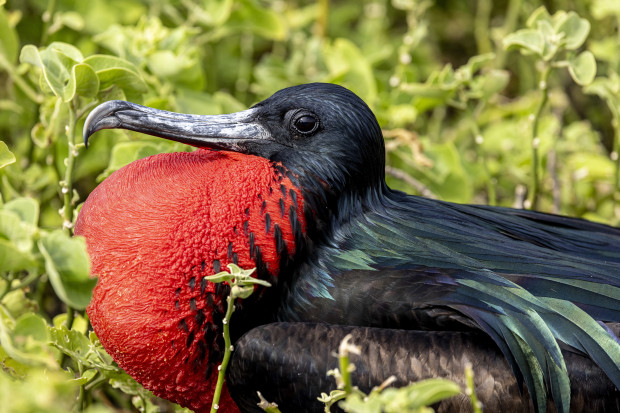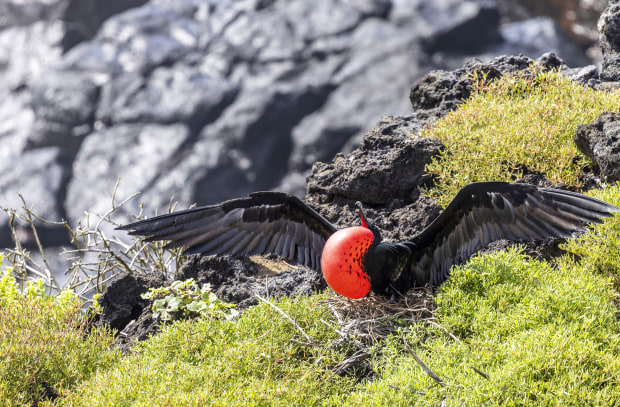 Galápagos frigatebirds rule the skies with their massive wingspans and show-stopping red throat pouches, puffed up like balloons during mating season as they try to impress the ladies with some serious flair.