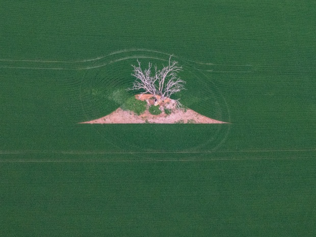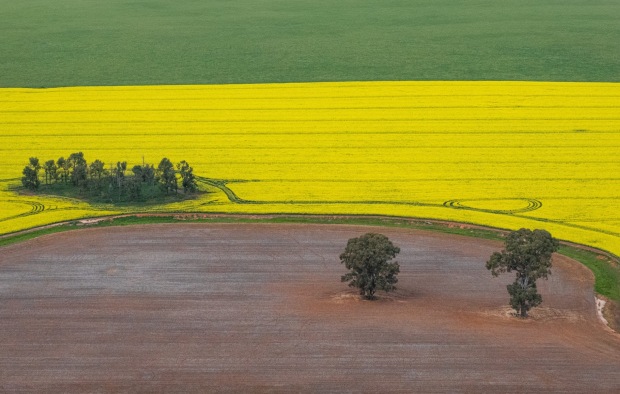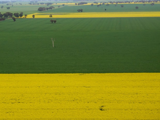While up in a Hot Air Balloon over the canola fields I was intrigued by the shapes and contrasting colours of the Canola and the new wheat fields .