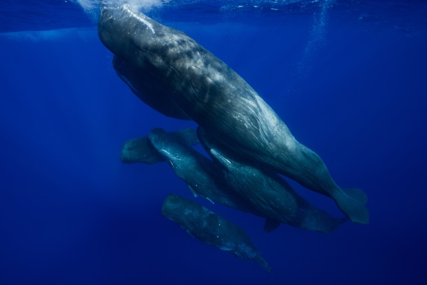 Whilst Sperm whales are known to dive 100s of kms deep to catch squid, but they are also incredibly playful and inquisitive when on the surface. These images show their playful side, with 6 whales in one shot playing together, one with its mouth open playing and two swimming underneath me upside down to check me out