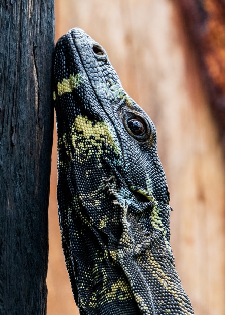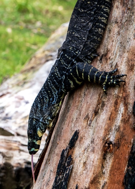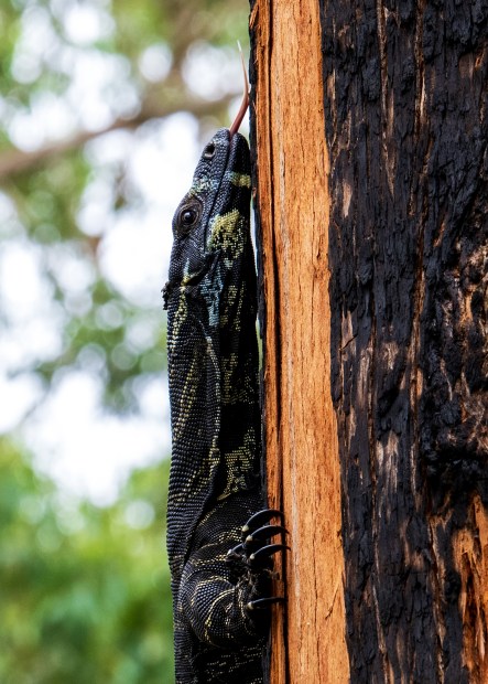 This series of four images captures the presence and resilience of goannas living in Gippsland’s bushland after fire. From the close detail of a watchful eye to the power of claws and the flick of a tongue, each photo reveals a different perspective of these reptiles in motion. Framed against both fresh and burnt bark, the images highlight the contrast of renewal and survival, telling a story of wildlife enduring within a scarred yet recovering landscape.