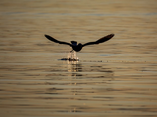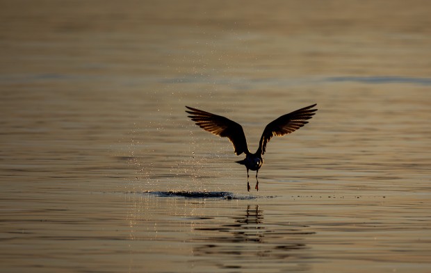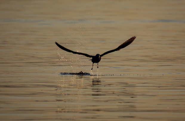 Its golden hour as the sun turns the water to various golden hues as a gull lifts off to take flight with water droplets bouncing off the surface.