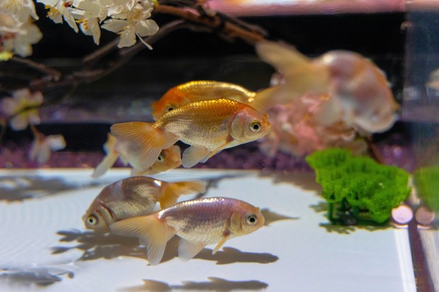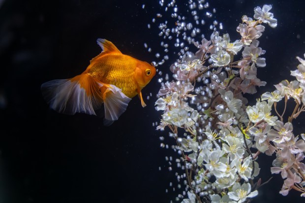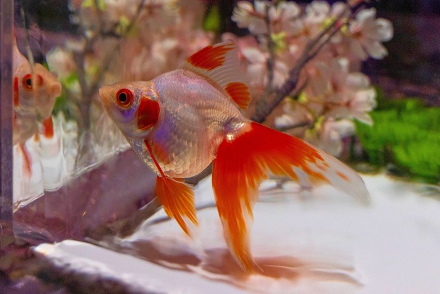 Small koi swimming amongst blossom plants in it's tiny aquarium
