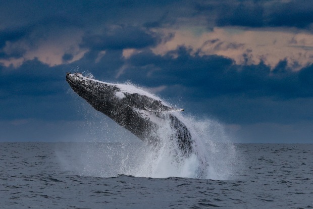 A massive humpback whale erupts from the ocean in a breathtaking breach, its enormous body suspended mid-air, framed dramatically against a moody twilight sky. The whale’s dark, textured skin is speckled with white patches and glistening droplets, catching the light as it twists with raw power and grace. Sea spray explodes around its body, capturing the energy of the moment as it defies gravity. Behind it, deep indigo clouds loom low, tinged with warm streaks of dusky pink and lavender, suggesting either dawn or dusk. The horizon is subtle, almost swallowed by the vast ocean and sky, giving the scene a wild, untamed feeling. This is a moment of awe — a rare and majestic display of nature's strength, freedom, and beauty all at once.