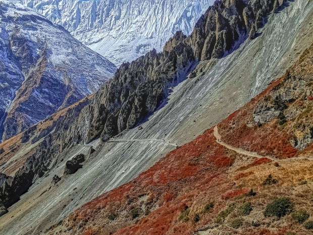 Ces photos ont été prises au Népal lors du trek du tour des Annapurnas, en automne, lorsque les montagnes étaient éclatantes de couleurs. Les images du lac ont été capturées au lac Tilicho, l’un des plus hauts du monde, entouré de falaises immenses sculptées par le temps. Là-haut, tout semble vaste et démesuré, au point d’en perdre tout repère. La majesté silencieuse de ces montagnes nous ramène à l’humilité et nous rappelle que nous ne sommes que de passage
