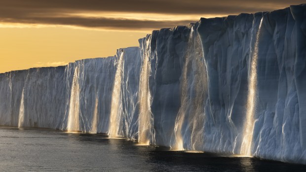 A massive iceberg in the Arctic catches the setting sun highlighting waterfalls plunging into the dark ocean below