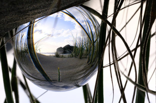 Up on the sand dunes I placed my Lens Ball amongst some dune grass. It's like I’m looking through a marble - the world is upside down, seems clearer and more focused. Nature is captured inside the ball; sand and dune grass framing it to give you focus on what you should really see. Taken at Te Henga Beach, Auckland, New Zealand