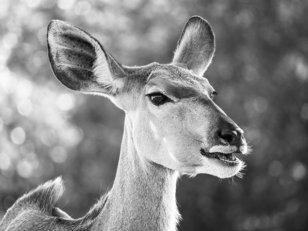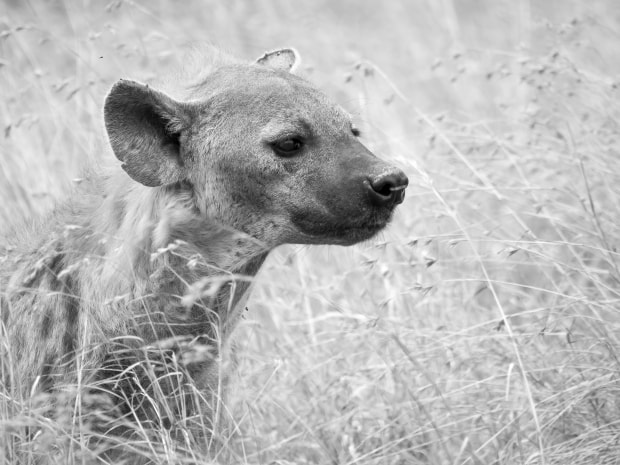 Black and white portraits of some of the wildlife in Kruger National Park, South Africa - leopard, hyena, giraffe, kudu