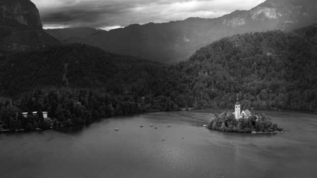 A dramatic black and white capture from Bled Castle, overlooking Lake Bled as storm clouds gather over the Slovenian Alps. Bled Island rests at the lake’s centre, crowned by the Church of the Mother of God — a striking symbol of Slovenia’s timeless beauty.