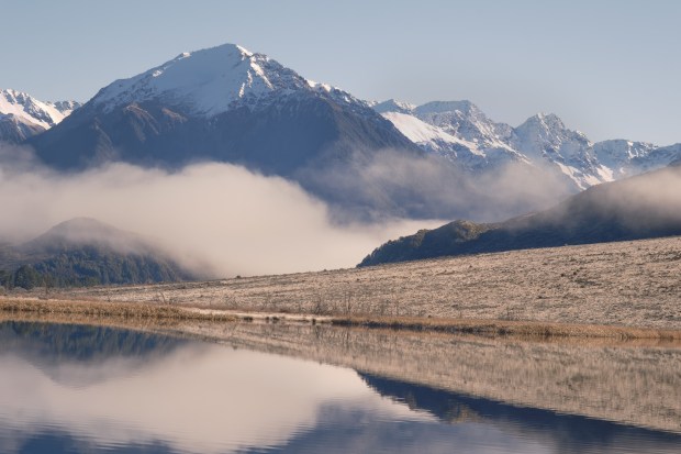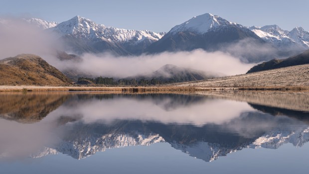 Lake Sarah, a beautiful 22 hectare lake close to Arthurs Pass, Canterbury, New Zealand. Surrounded by native bush and snow covered mountains in the winter months.