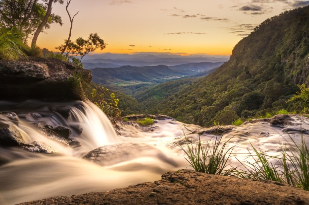 Morans Falls, Lamington National Park After several hours watching the changing light at these beautiful unique falls seeing the setting sun magic as the water cascades over the edge I was lucky to capture this shot. Well worth the night hike back out for sure.
