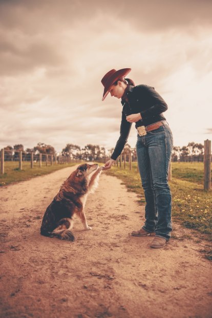 Down on the dirt track at the horse cutting event, I was photographing Lianne and her dog, Julia. She leaned down with her hand out, and Julia rested her paw in hers. The late-day light hit the track behind them just right, and it was such a special moment—I loved being able to capture that little connection between them.