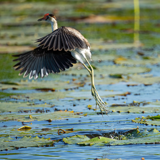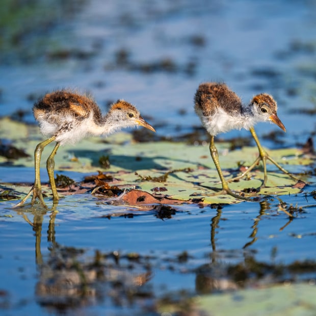 This portfolio celebrates the extraordinary life of the comb-crested jacana, a bird whose oversized toes allow it to appear as though it walks on water. Moving lightly across floating lilies, the adult demonstrates both grace and precision, while its downy chicks mimic the same improbable feat on unsteady legs.