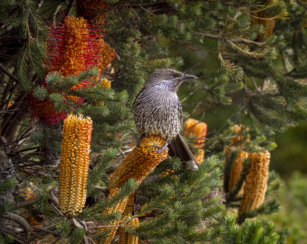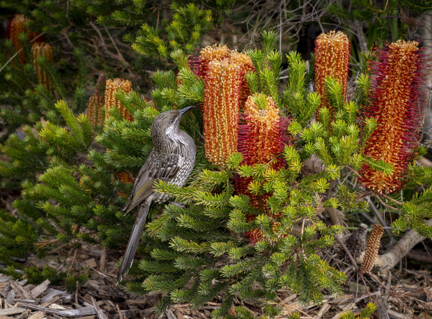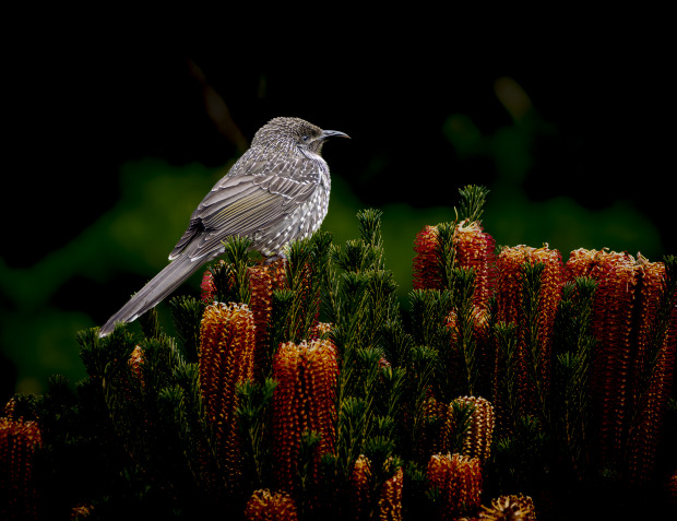 A Little Wattle Bird sats amidst the Beautiful Banksia early morning with dark shadow backdrop