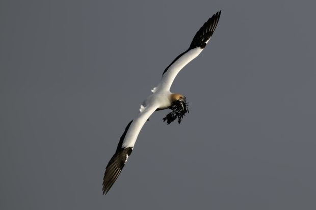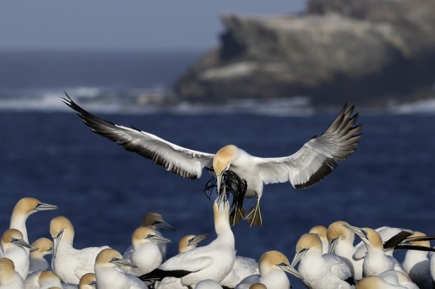 Love is in the air as male Gannets return to the colony. Males return with sea weed and present it to their partners. The sea weed is later used for nest building along with soil. Australasian Diving Gannet (morus serrator)