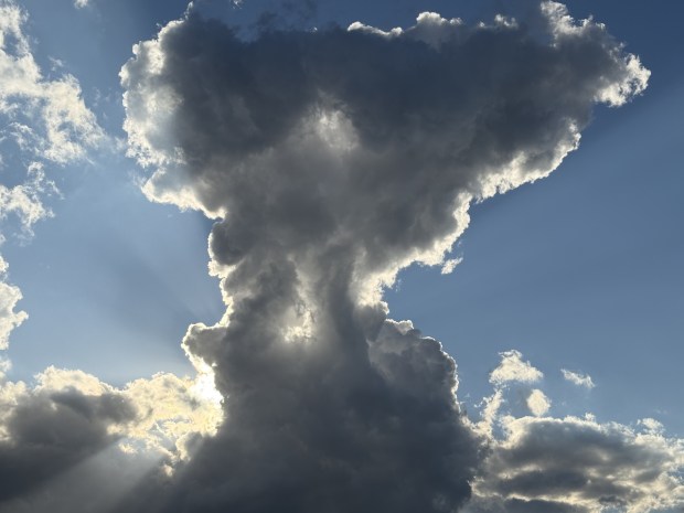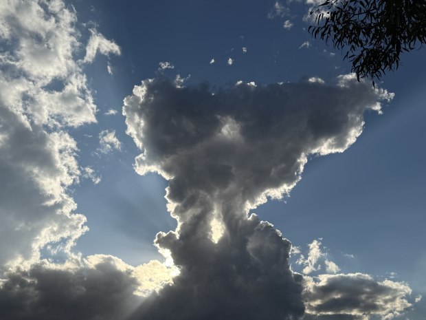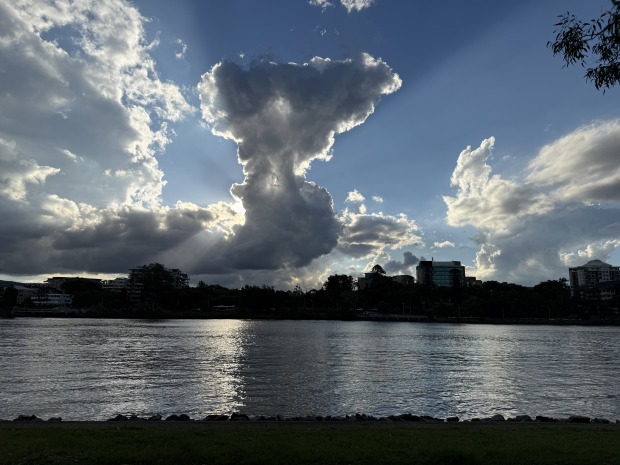 Cumulus clouds backlit by the sun over the Brisbane River at West End. Photos taken on Sunday 18 May 2025 between 3:30pm and 4:00pm using an iPhone 16 Pro.