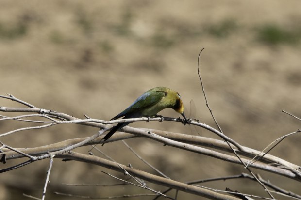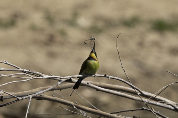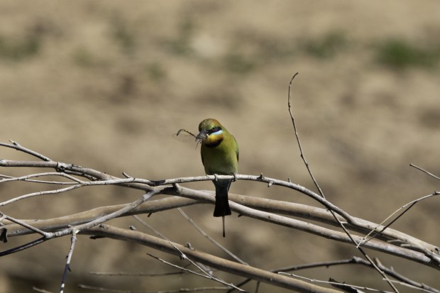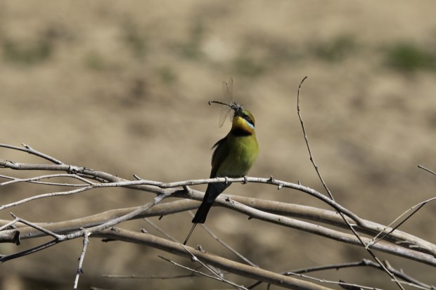 Watching the Rainbow Bee-eater perching on the branches of a fallen tree in the dam near Tibooburra, NSW, with their catch of a dragonfly, moving it around in it's beak and hitting it against the branch to kill it, was amazing to see, let alone to photograph. This beautiful bird was almost posing while eating her catch.