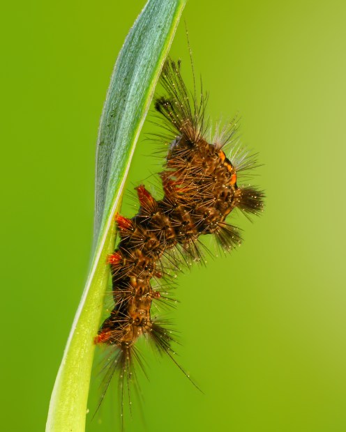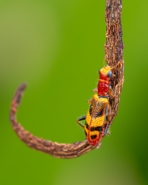 Set against a lush green backdrop, these macro portraits showcase four creatures—the robber fly, orbweaver spider, clerid beetle, and tussock moth caterpillar—each displaying an element of the yellow, orange and red palette. The contrast between the calm green of nature and the palette of the insects brings their character and vitality into focus. By revealing the beauty of creatures often overlooked, these macro images invite viewers to pause, reflect, and marvel at the tiny wonders thriving in our own backyards.