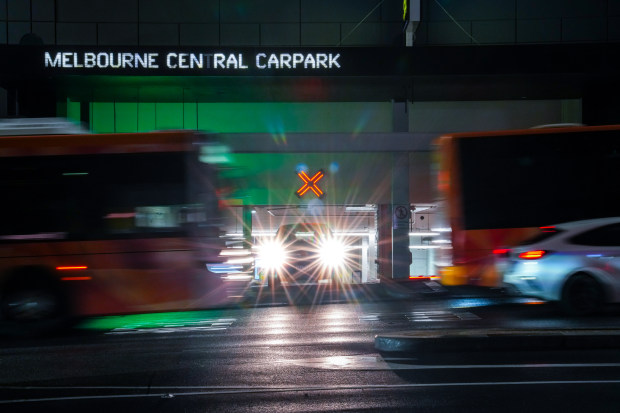 The glowing of headlights and blurred trail of movement contrast against the static architecture, reflecting Melbourne’s dynamic energy and unceasing flow.